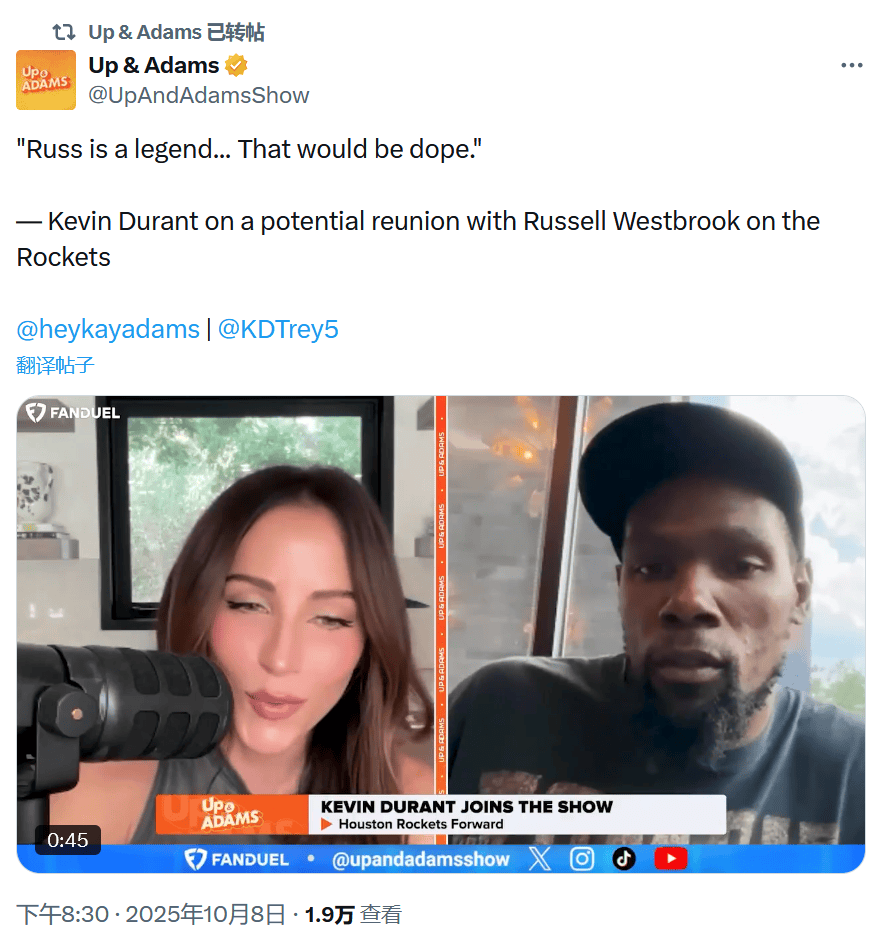 杜兰特对此这样说道:“我不清楚,我也是听说的。通常当这种事情发生时,会声势浩大,但我在互联网之外并没有听到。威少是一位传奇人物,我认为他现在理应留在NBA,也应该按照自己的意愿离开联盟。所以没错,那会非常酷。但是这件事我做不了主。”