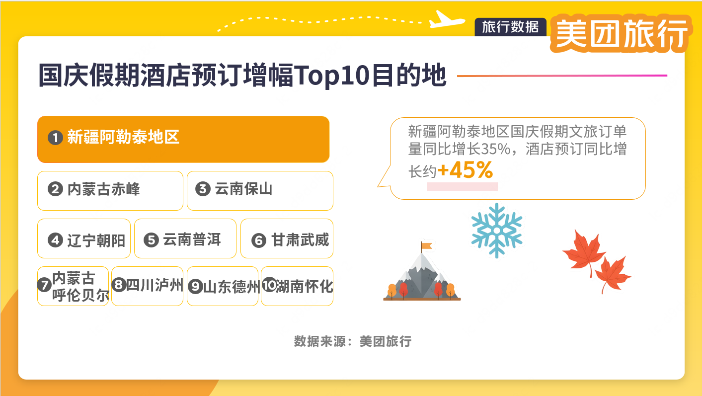 美团平台旅行数据显示,国庆假期酒店预订增幅Top10目的地分别为:新疆阿勒泰地区、内蒙古赤峰、云南保山、辽宁朝阳、云南普洱、甘肃武威、内蒙古呼伦贝尔、四川泸州、山东德州、湖南怀化,其中大部分均是长线游的典型目的地。以新疆阿勒泰地区为例,平台国庆假期文旅订单量同比增长35%,酒店预订同比增长约45%。内蒙古赤峰、云南保山、四川泸州等目的地国庆假期文旅订单量均增超50%。