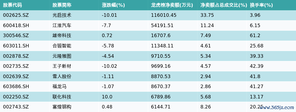 南财智讯6月3日电,南财金融终端数据显示益配资,因当日异动登上龙虎榜的个股中,龙虎榜中资金净流出最多的前三位分别是光启技术(002625.SZ)、江淮汽车(600418.SH)与雄帝科技(300546.SZ)。其中排名第一的光启技术被净卖出11.6亿元,占总成交金额的33.75%。光启技术收盘下跌10.01%,换手率为3.96%。净卖出额前10个股详情见下图: